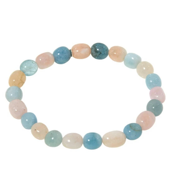 - Bracelet has nugget-shaped beads of blue aquamarine and pink morganite strung in alternating pattern on jeweler’s stretch elastic
