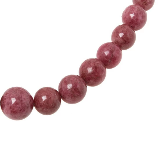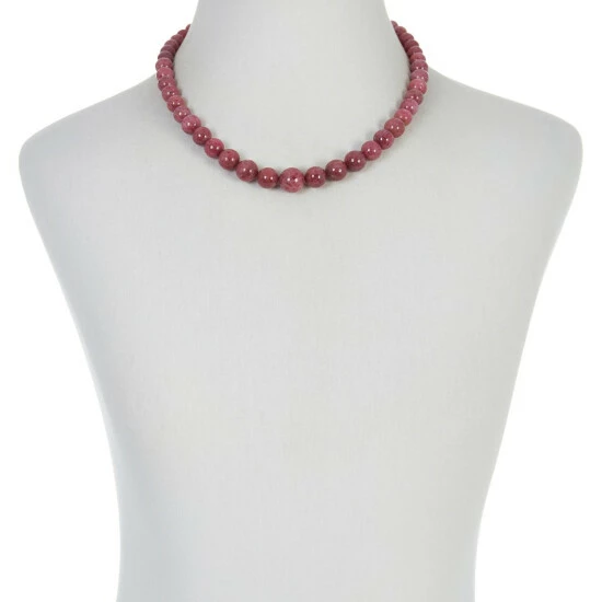 - Necklace has round, polished pink rhodonite beads strung in slight graduated profile