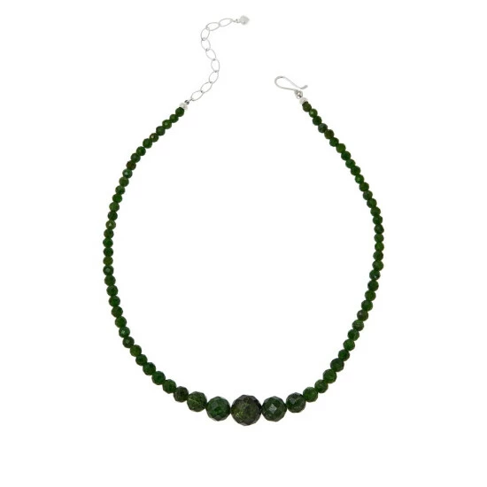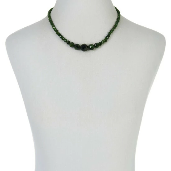 - Necklace has round, faceted green chrome diopside beads strung in graduating profile