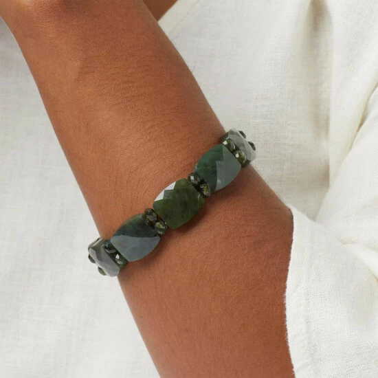 - Stretch bracelet of faceted freeform stabilized dark green nephrite jade stones separated by pairs of stabilized dark green nephrite jade faceted rondelles