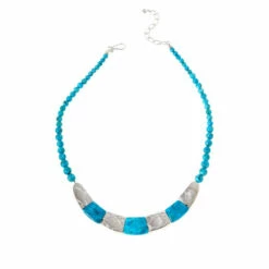 - Necklace drape has curved, compressed turquoise stations alternating with textured silver stations