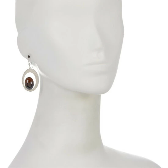- Sterling silver, open oval earring drops have oval, multi-color brown sunset stone bezel set at base