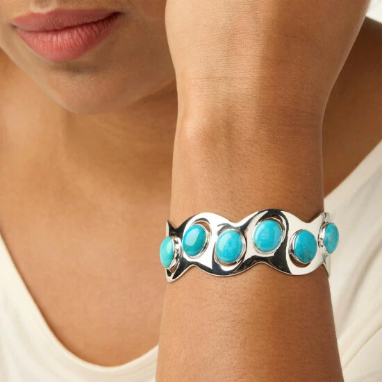 - Cuff bracelet has wavy-edge base with six oval blue turquoise cabochons bezel-set across top