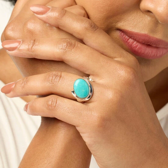 - Sterling silver ring has bezel-set, oval turquoise cabochon offset in center