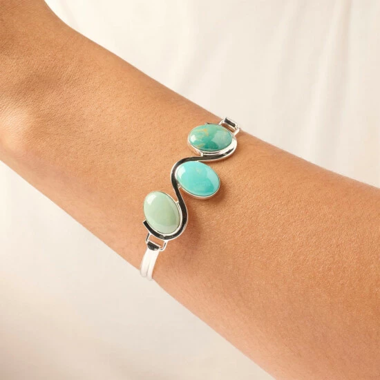 - Cuff bracelet has wavy-edge base with three oval multicolor turquoise cabochons bezel-set across top