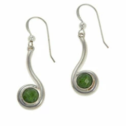 - Sterling silver earring drops have elongated silver piece with round, green chrome diopside cabochon bezel-set on end