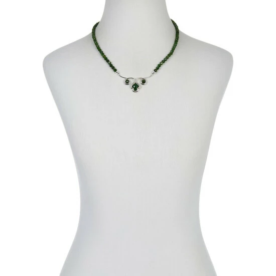 - Necklace has decorative, sterling silver center station withone freeform and two round, bezel-set, faceted green chrome diopside stones