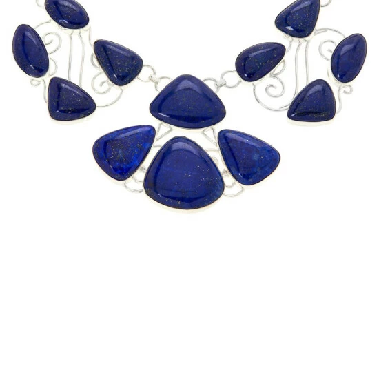 - Sterling silver necklace drape has bezel-set, freeform blue lapis stones connected via decorative wire scrollwork design
