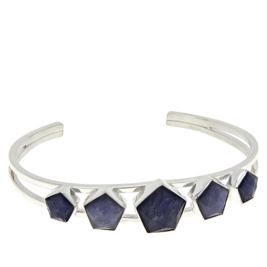 - Sterling silver split-top cuff bracelet hasfive, faceted pentagon-shaped blue tanzanite stones bezel-set across top