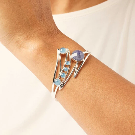 A unique, contemporary design dotted with beautiful blue tanzanite and aquamarine stones, help this exclusive sterling silver cuff bracelet make a bold style statement on your wrist. From Jay’s Gallery Collection.