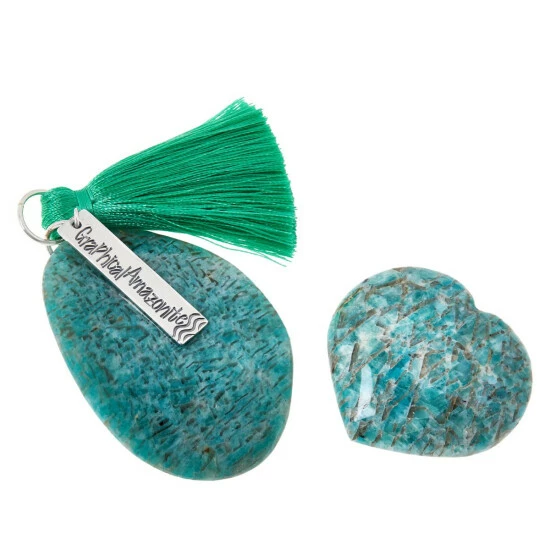 Pick up these beautiful specimens of graphical amazonite for the intrepid rock hound in your life. Two polished shapes of graphical amazonite from Madagascar, with its unique mix of blue, green and black colors, will make a great addition to any collection.