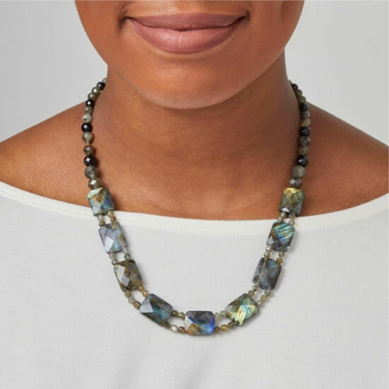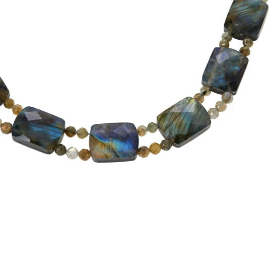- Double-sided composite beads connected via double row of round, labradorite beads