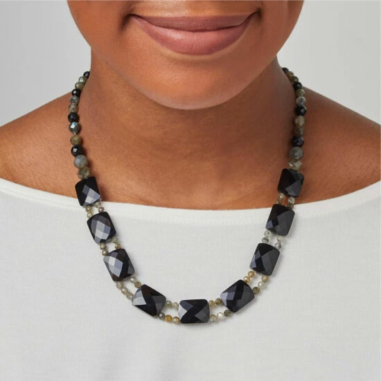 - Necklace has reversible drape comprised of cushion-cut, rectangular, doubled-sided gray labradorite and black chalcedony beads