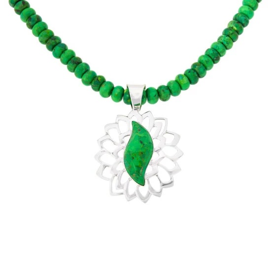 - Sterling silver pendant has freeform, green lemon lime turquoise composite stone at center of open, floral-like frame