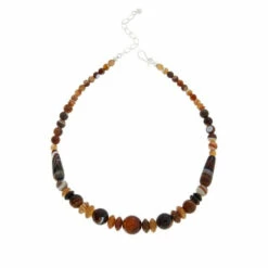- Necklace has multi-shaped, multicolor banded beads of coffee chalcedony