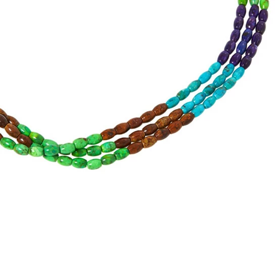 - Necklace has three strands of black, blue, green and purple turquoise and brown jarosite beads strung in color-block pattern
