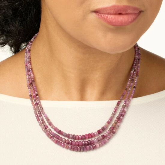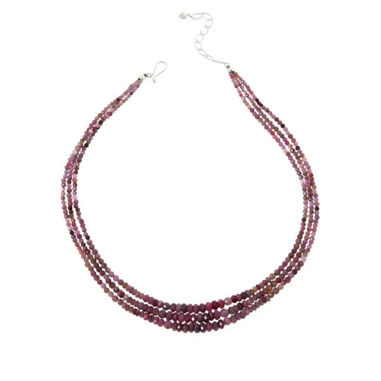 Tiny beads of natural Indian ruby,strung in a three-strand layered silhouette, are sure to add a sophisticated touch of elegant gemstone color to your neckline. From Jay King.