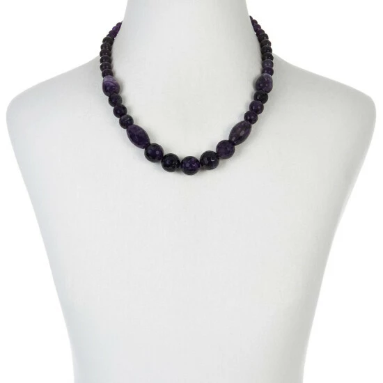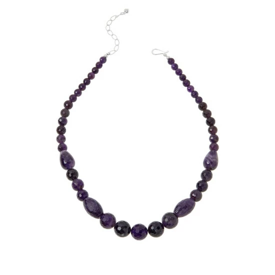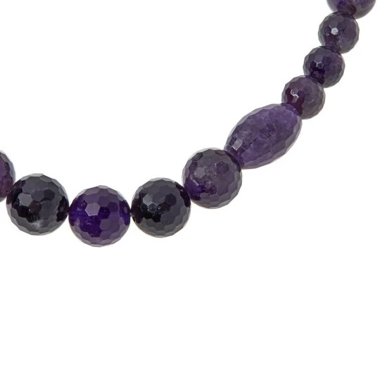 - Necklace has faceted round, barrel- and pear-shaped amethyst beads