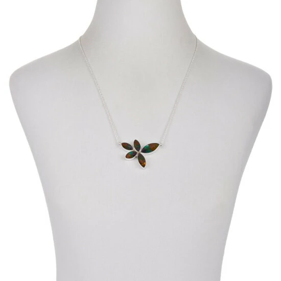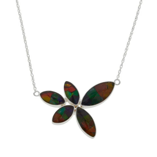 - Necklace has abstract petal design comprised of marquise-shaped, multi-color inlaid ammolite