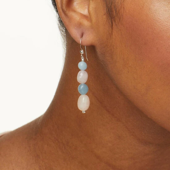 - Each drop has two blue aquamarine beads and two pink morganite beads