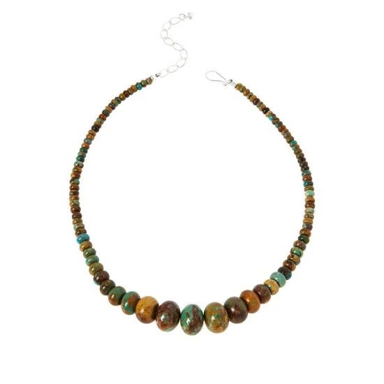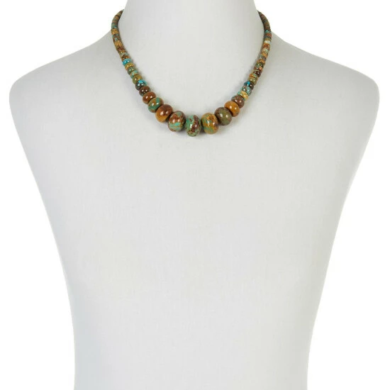 - Necklace has rondelle-shaped, multicolor turquoise beads strung in graduating profile