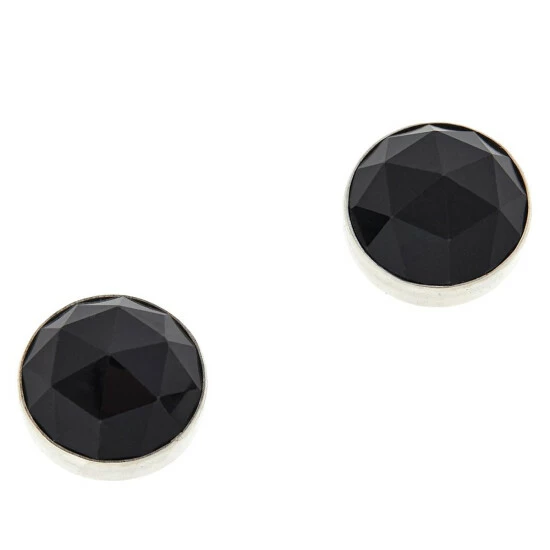 - Stud earrings have round, faceted black calcite stones bezel-set on post fronts