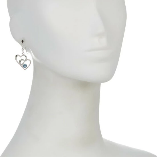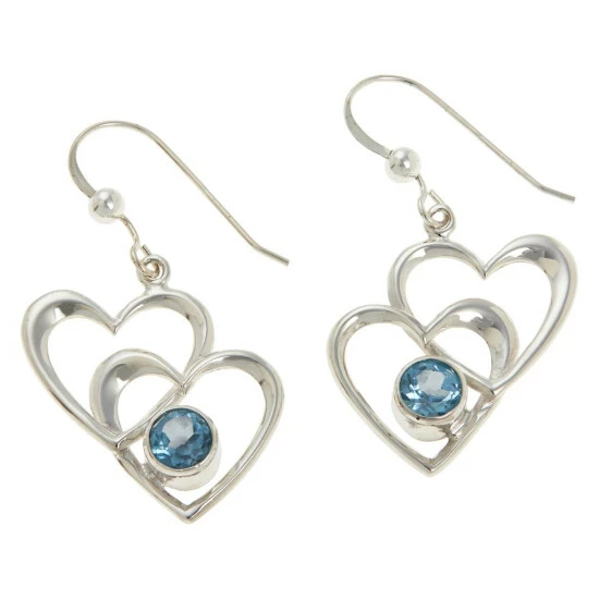 - Sterling silver earring drops have double, open heart design with round, facetedblue topazstone accent