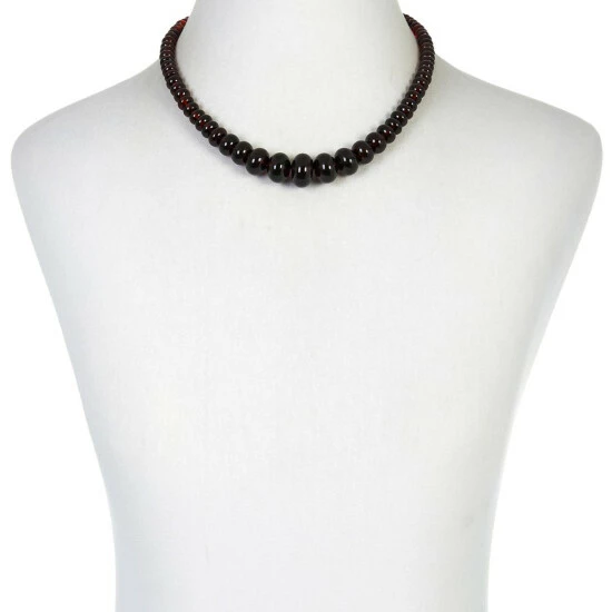 - Necklace has rondelle-shaped, brown amber beads strung in graduated profile