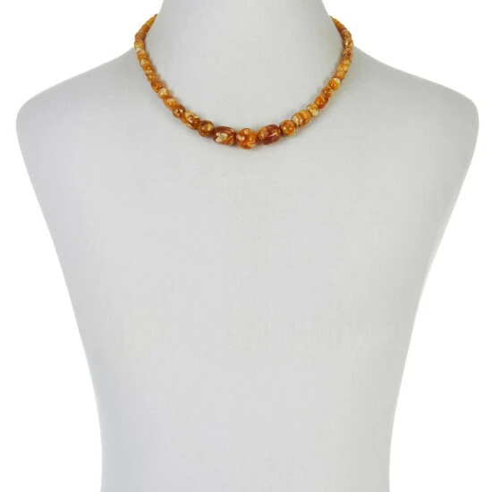 - Necklace has round and barrel-shaped, multi-color compressed butterscotch amber beads strung in graduated profile