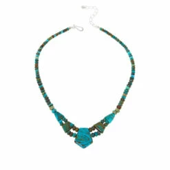 - Necklace drape has pentagon-shaped turquoise station at center and four freeform turquoise stations connected by two rows of rondelle-shaped turquoise beads
