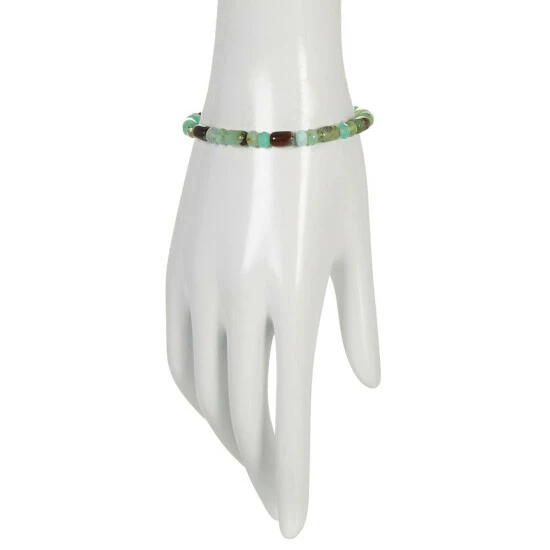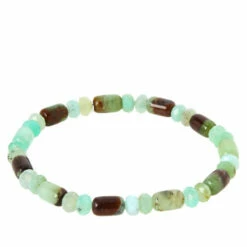 - Stretch bracelet has rondelle- and barrel-shaped beads of green/brown chrysoprase strung on jeweler’s elastic