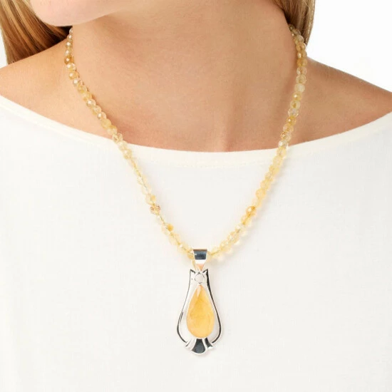 - Elongated pear-shaped, sterling silver pendant design has checkerboard-faceted, pear-shaped yellow citrine stone bezel-set in center