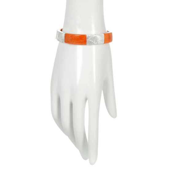 - Stretch bracelet has compressed, curved coral stations alternating with textured silver stations in bangle-style profile