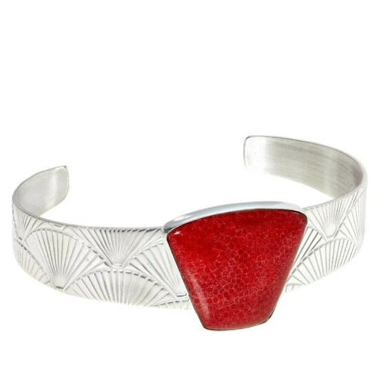 - Sterling silver cuff bracelet has freeform, geometric compressed coral stone bezel-set atop center