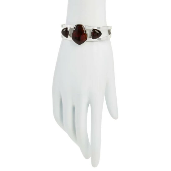 - Sterling silver, split-top cuff bracelet hasone large and two smaller, freeform, compressed brown amber stones bezel-set across top