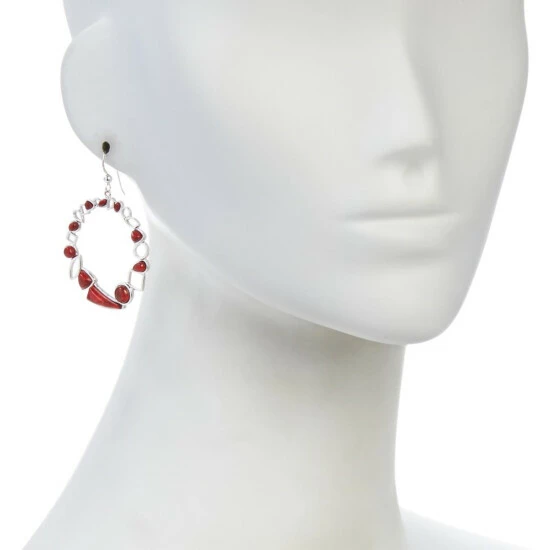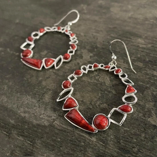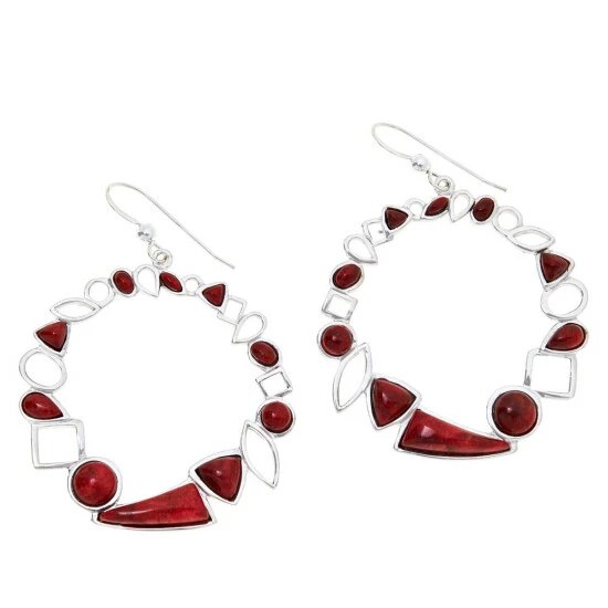 - Sterling silver, open, circular earring drops have bezel-set, geometric and freeform shapes of color-enhanced, compressed red coral