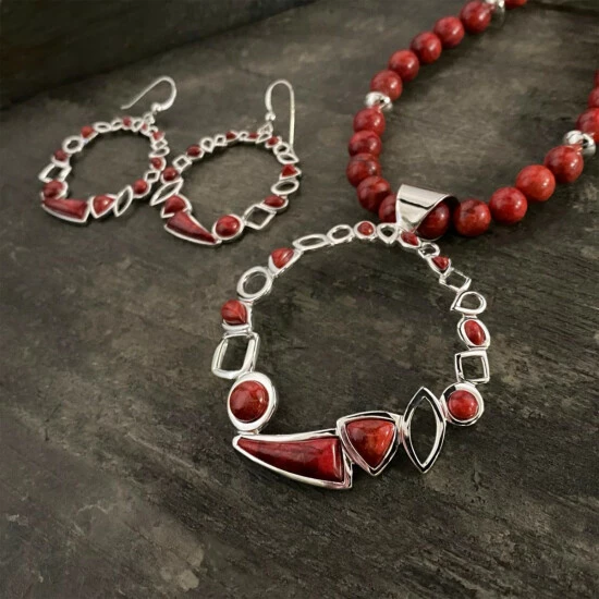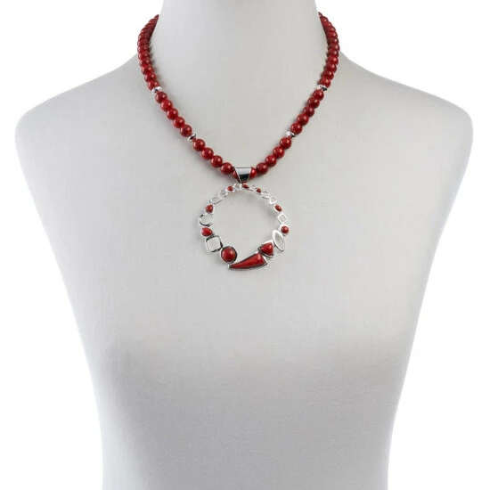 - Sterling silver, open, circular pendant has bezel-set, geometric and freeform shapes of color-enhanced, compressed red coral