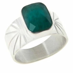 - Ring has cushion-cut green emerald stone bezel-set atop wide band