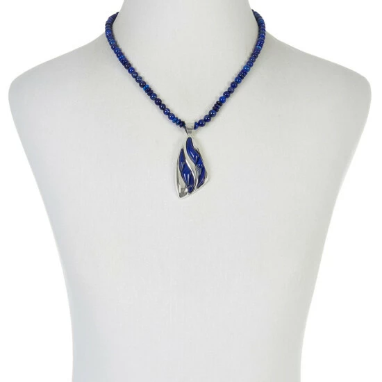 - Sterling silver, elongated freeform pendant has wavy lapis shapes inlaid on front side; wide, tapered bail