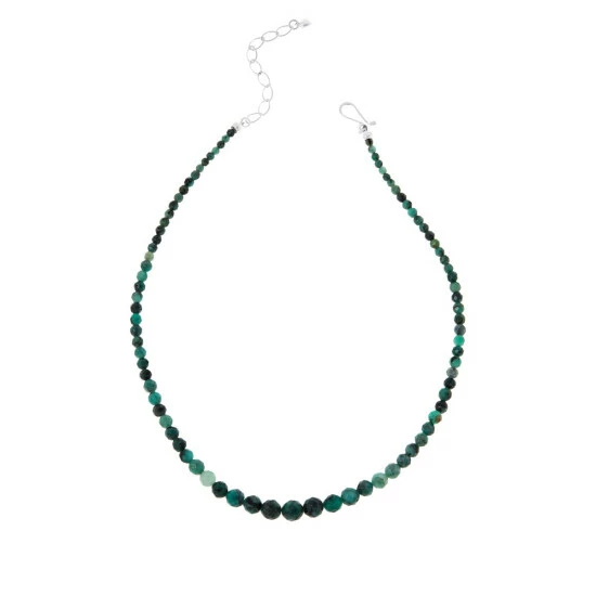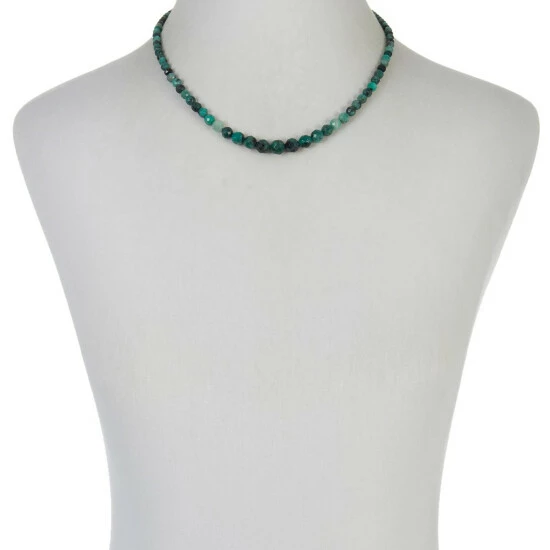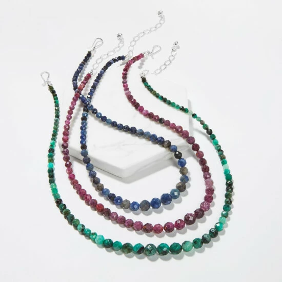 - Necklace has round, faceted gemstone beads in varying shades strung in a slightly graduated profile