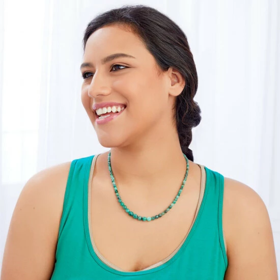 Gemstone beads in varying shades, strung in a slightly graduated profile, willadd a sophisticated touch of elegant gemstone color to your neckline.