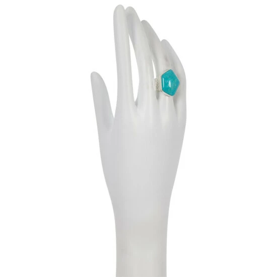 - Sterling silver ring has pentagon-shaped turquoise stone bezel-set atop wide band