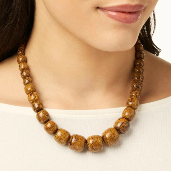 - Necklace has drum-shaped beads of brown/gold sparkle stone strung in graduating profile