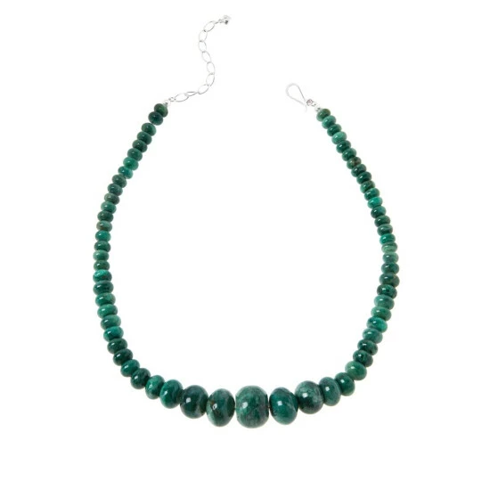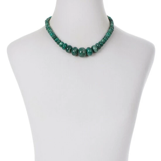 - Necklace has rondelle-shaped, green quartz beads strung in graduating profile