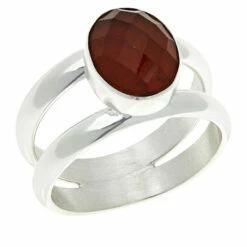 - Ring has oval, checkerboard-faceted brown hessonite stone bezel-set atop split band