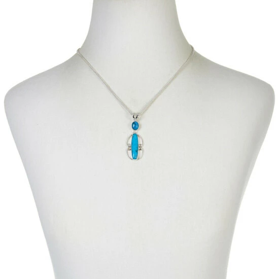 - Pendant has elongated, barrel-shaped turquoise in open, scroll work frame topped by oval turquoise