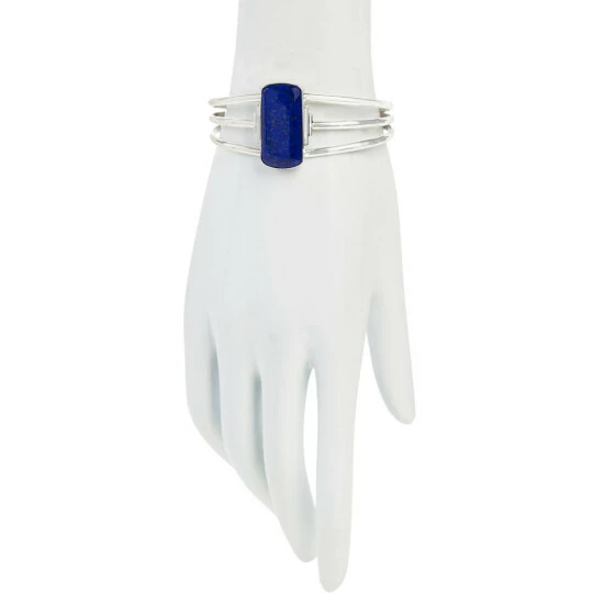 - Sterling silver, tri-split cuff bracelet has single, rectangular-shaped blue lapis bezel-set in center