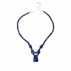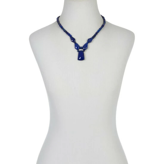 - Necklace has center drop/drape comprised of five freeform lapis shapes