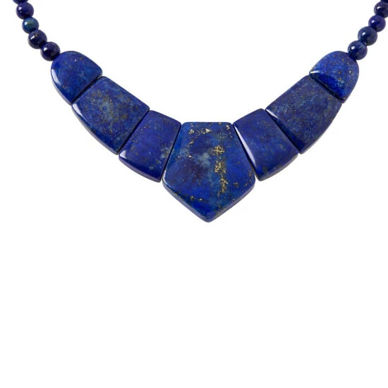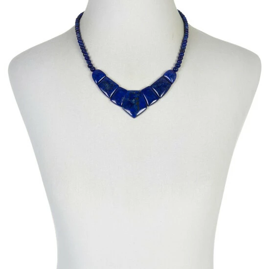 - Necklace has center drape comprised of sevenfreeform lapis shapes that form center point