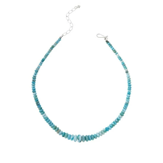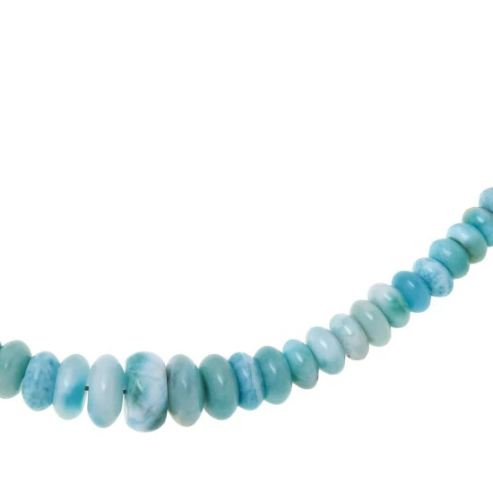 - Necklace has rondelle-shaped beads of blue-green larimar strung in slight graduated profile